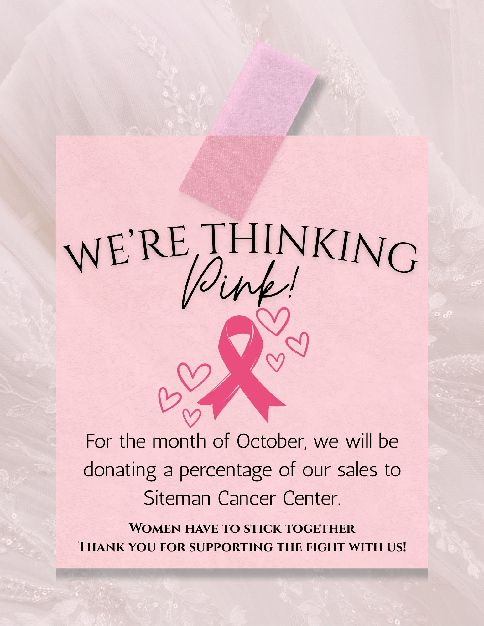 Siteman Cancer Center Donation Event Wednesday, October 1, 2025 11:00 AM 11:00 Friday, October 31, 2025 4:00 PM 16:00 Cleo Bridal 103 Civic Park Drive O'Fallon, MO, 63366 United States (map) Google Calendar ICS For the entire month of October, Cleo Bridal will donate a potion of our sales to Siteman Cancer Center in St Louis, MO. This is an annual event that we host in honor of Breast Cancer Awareness month. Join us in the fight against cancer.